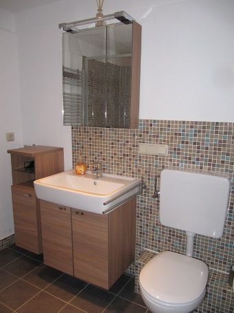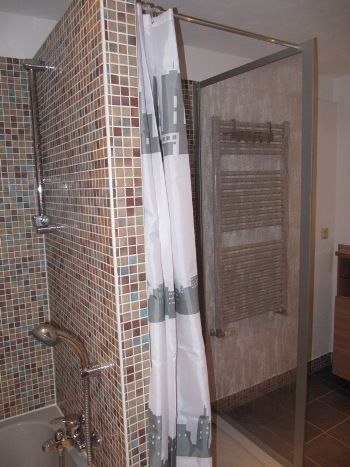 Ausgestattet ist das Bad mit Duschwanne und Dusche.