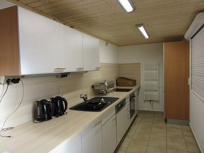 Komplett eingerichtet Küche mit großem Kühlschrank, Backofen, Ceranfeld und Kochgeschirr